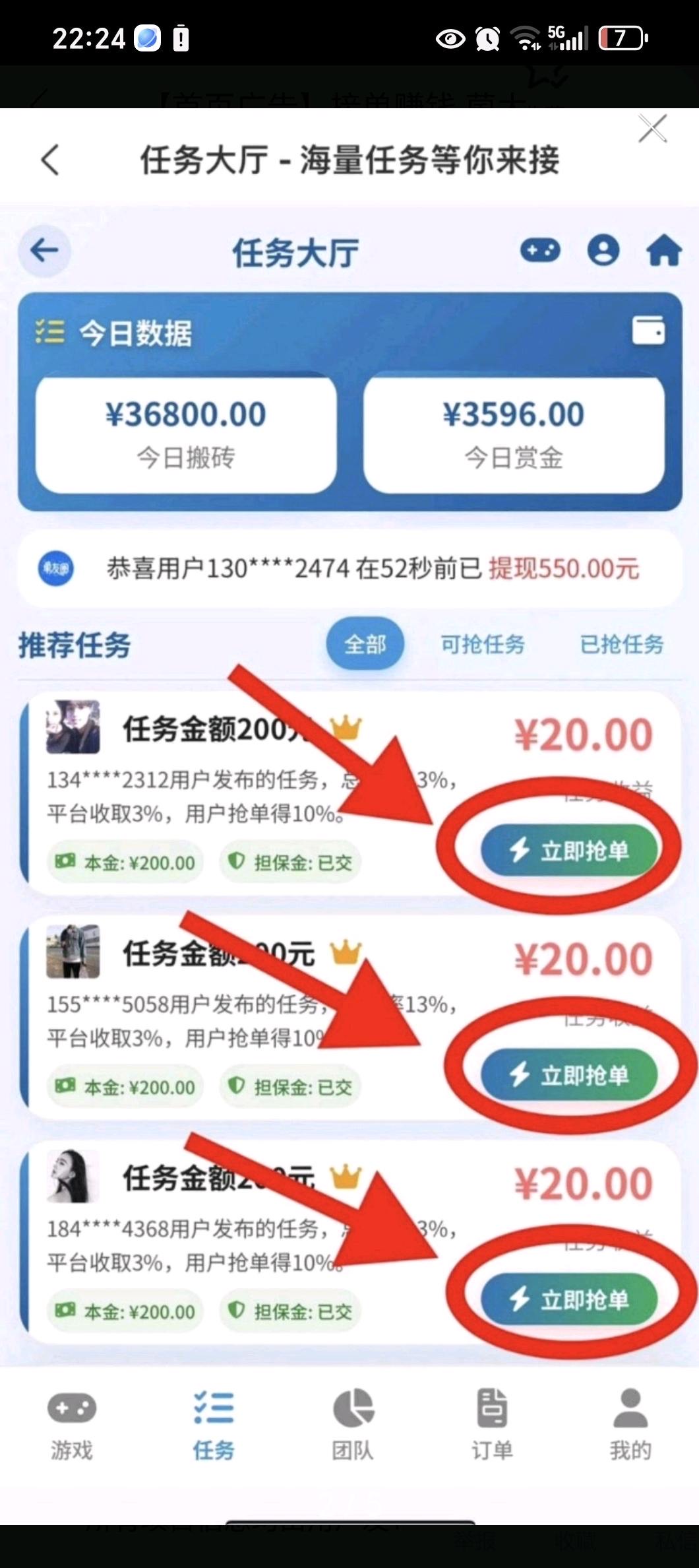 一天赚500-1500米,抢单代付,只能有时间一天做到晚.都可以。